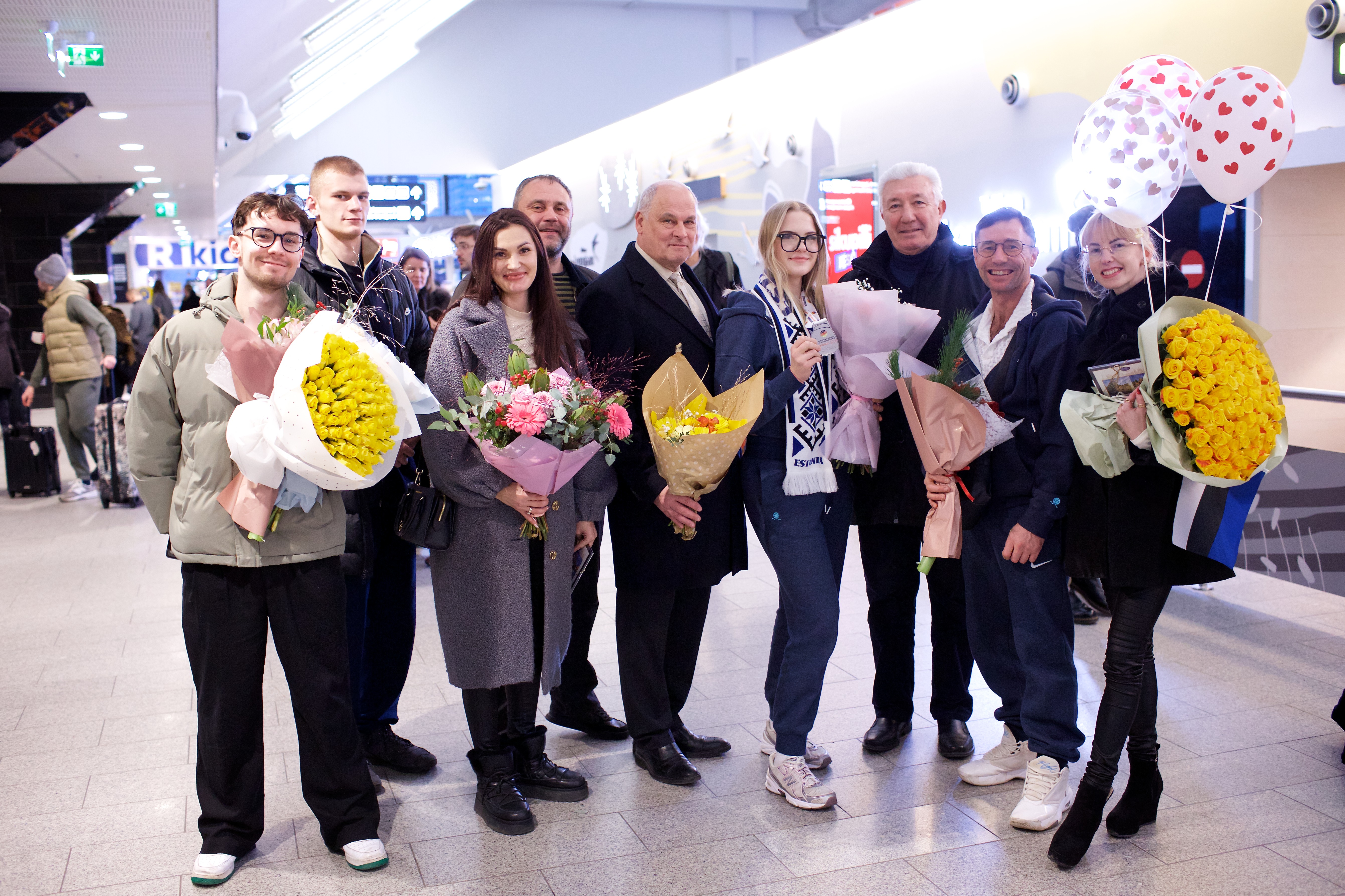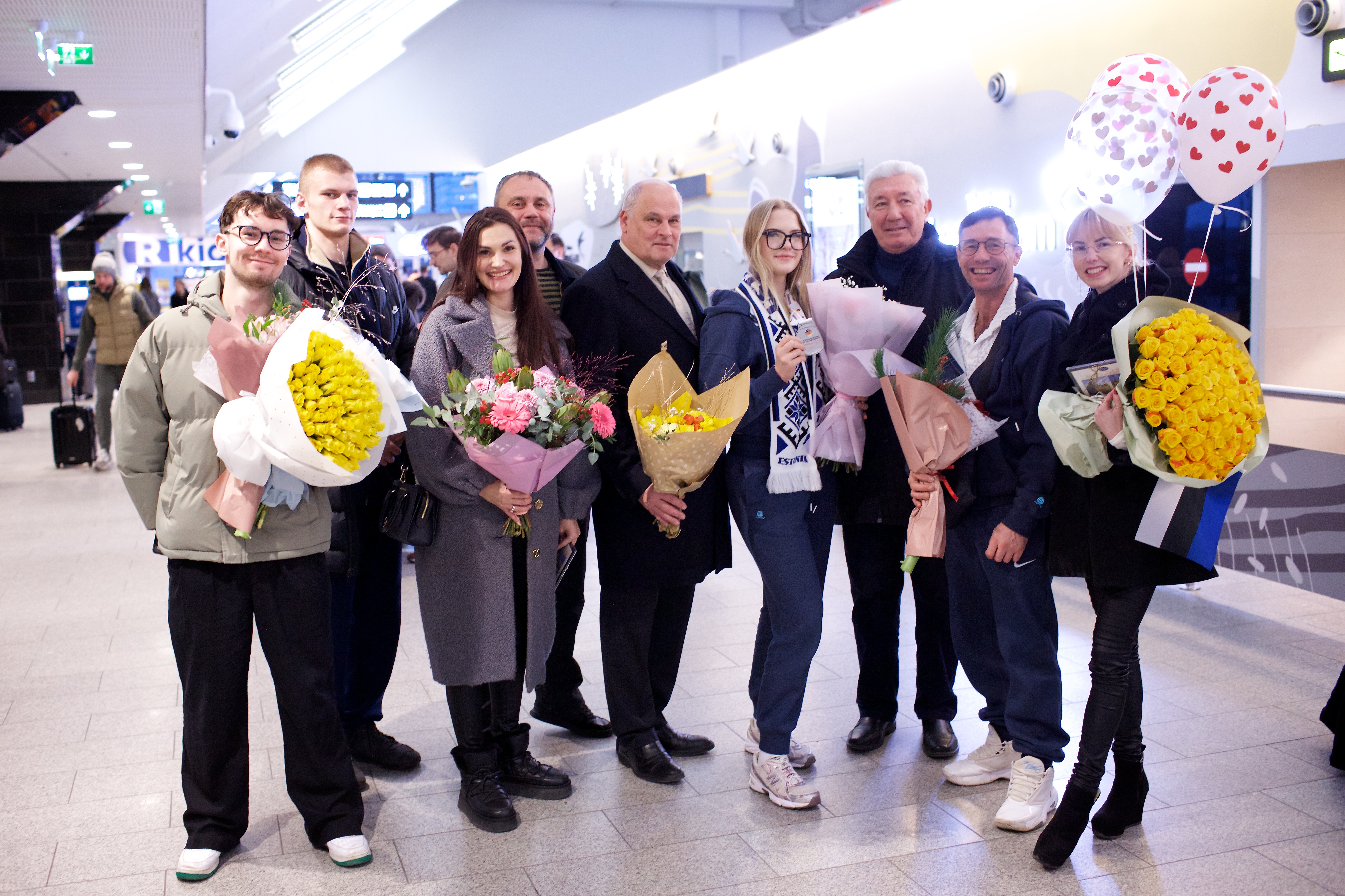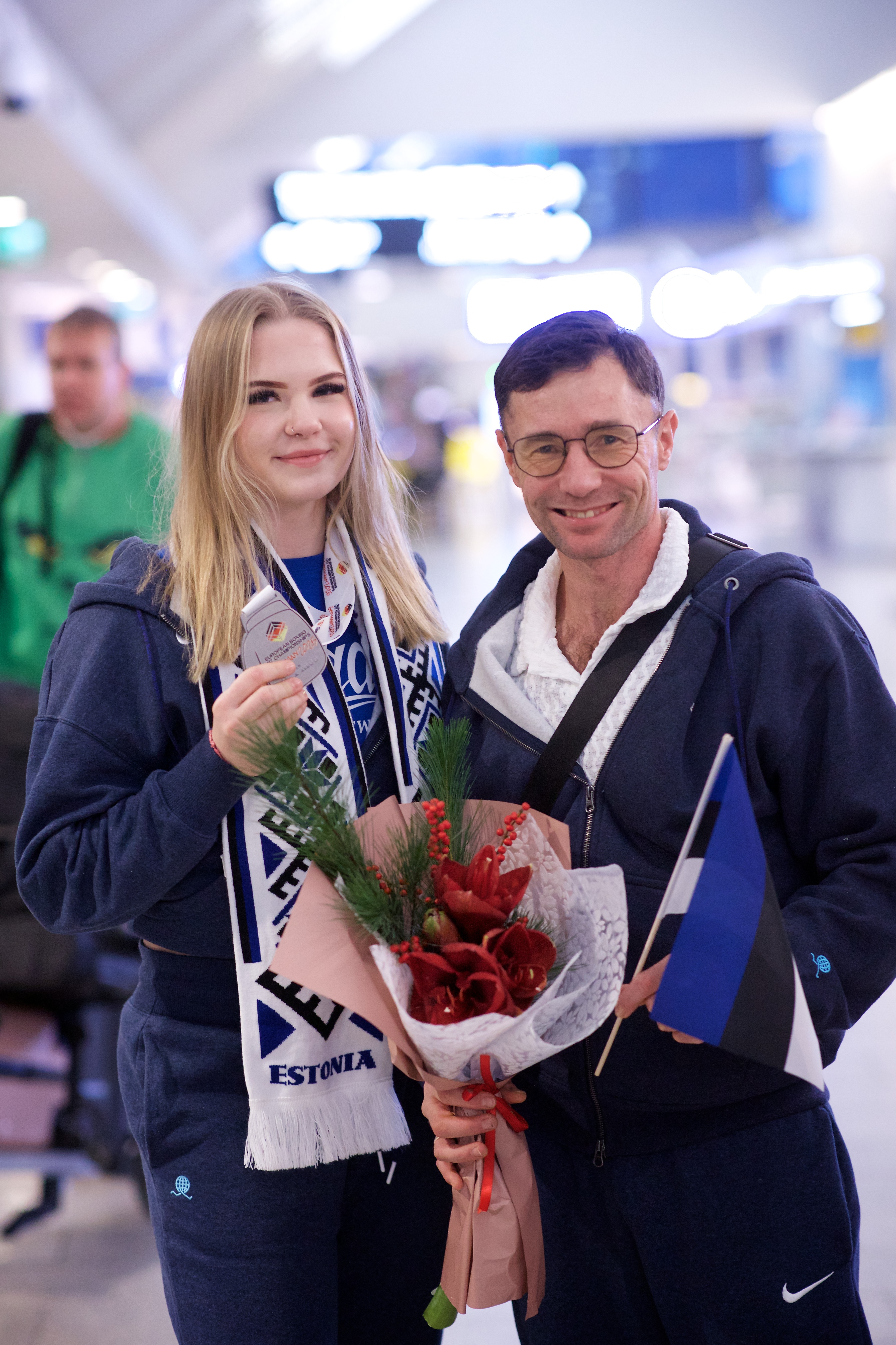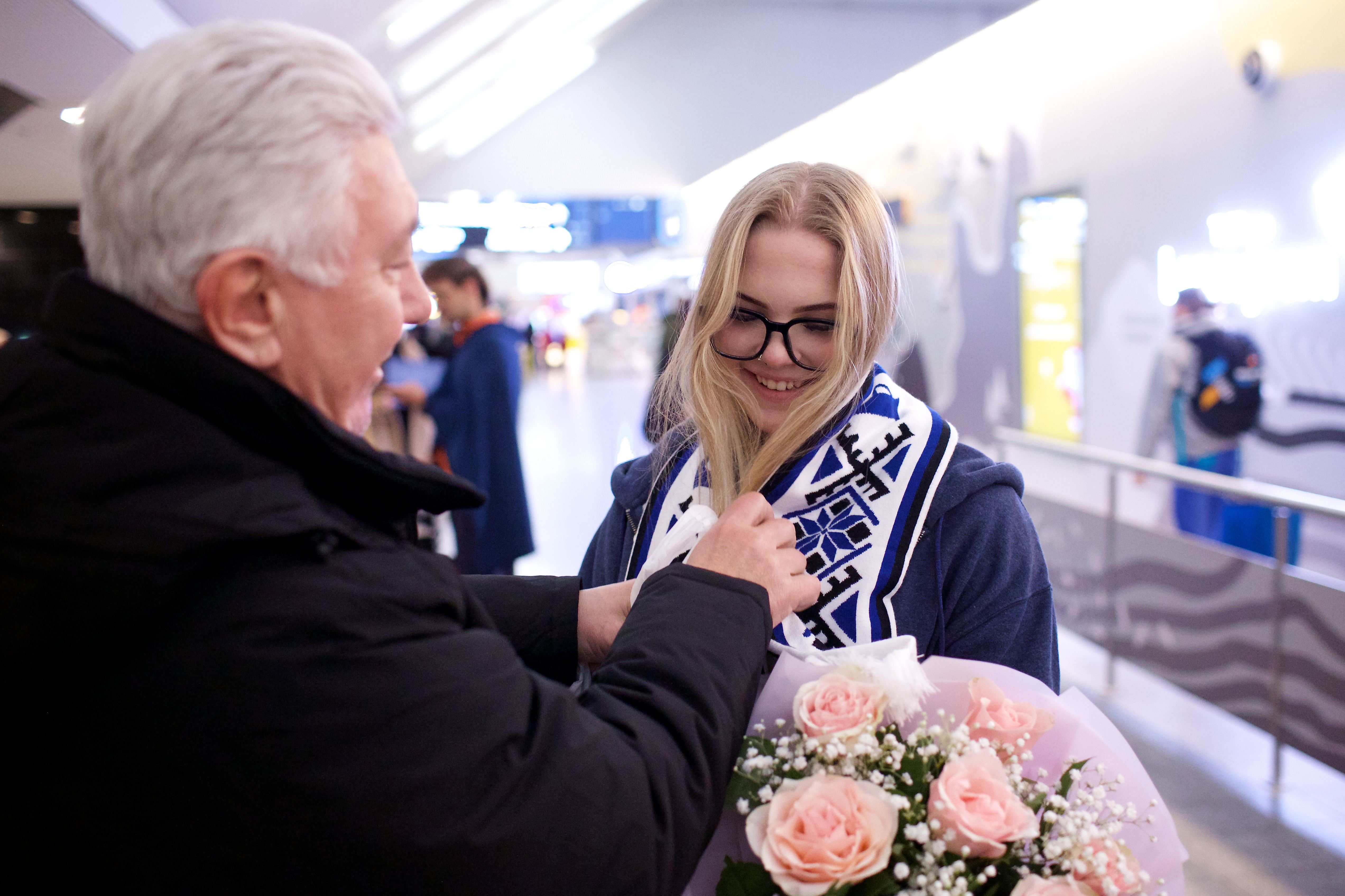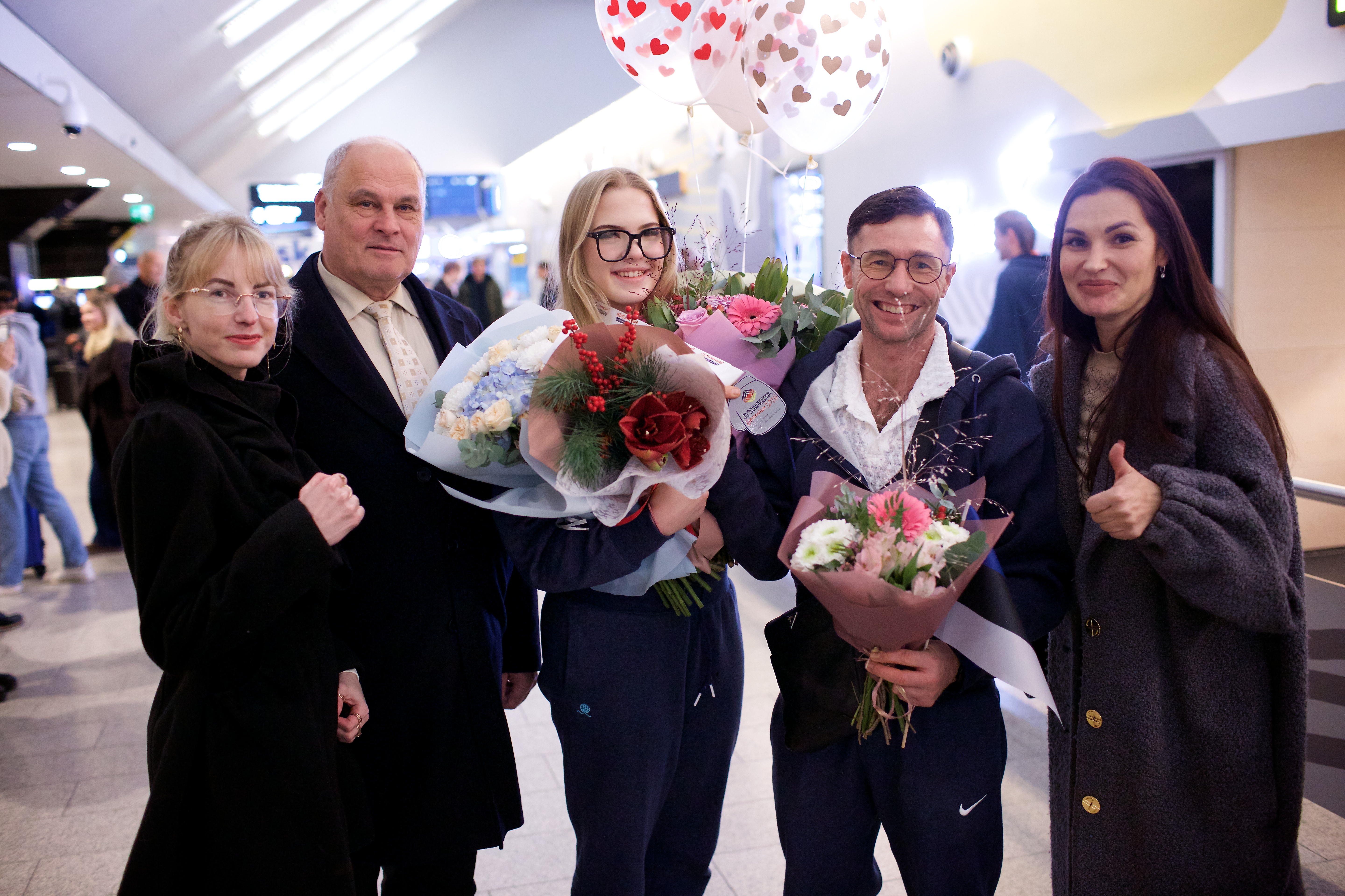 Pilte Melana Nelgi ja tema treeneri Jevgeni Golovatši vastuvõtust Lennart Meri lennujaamas.