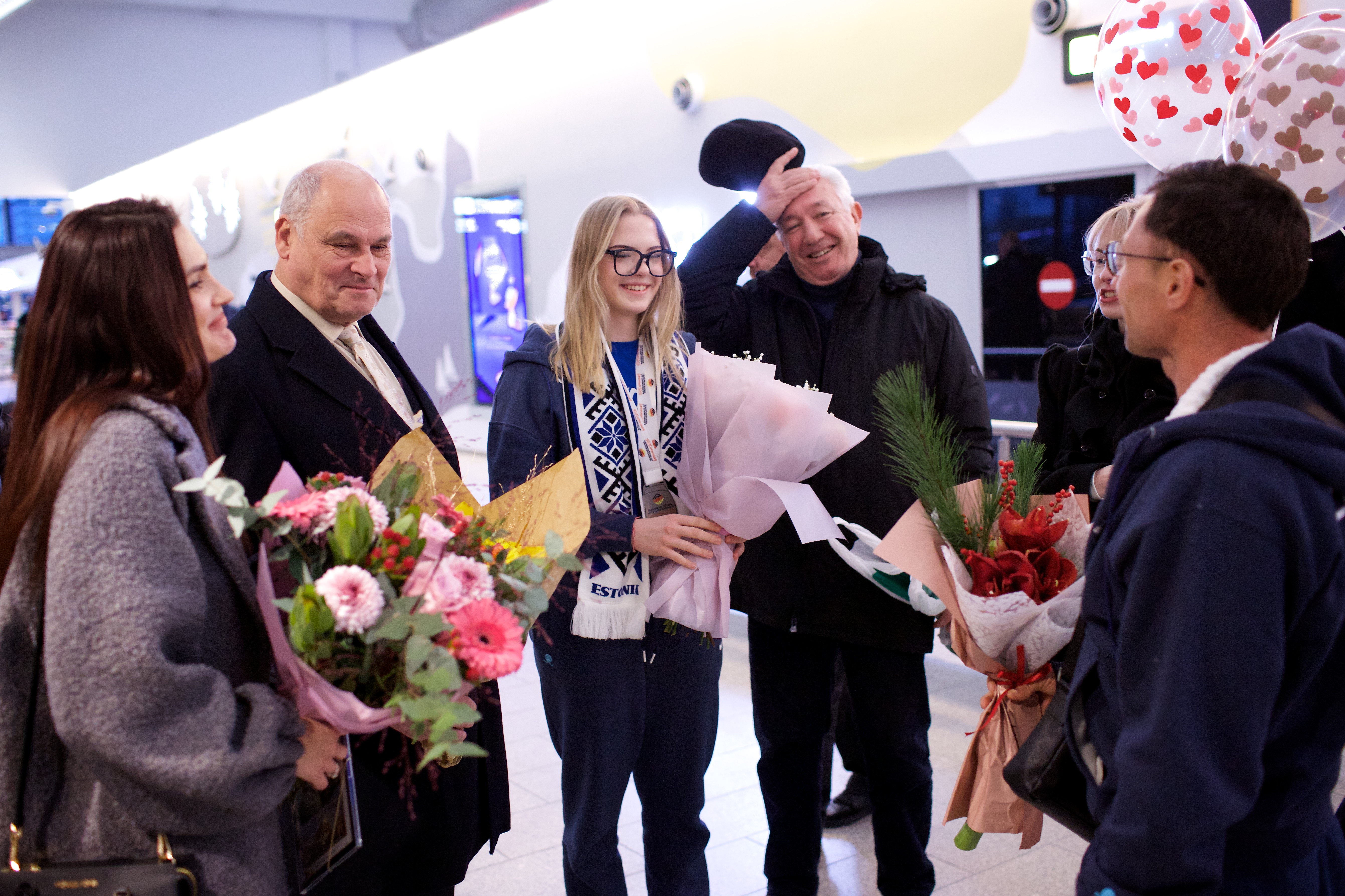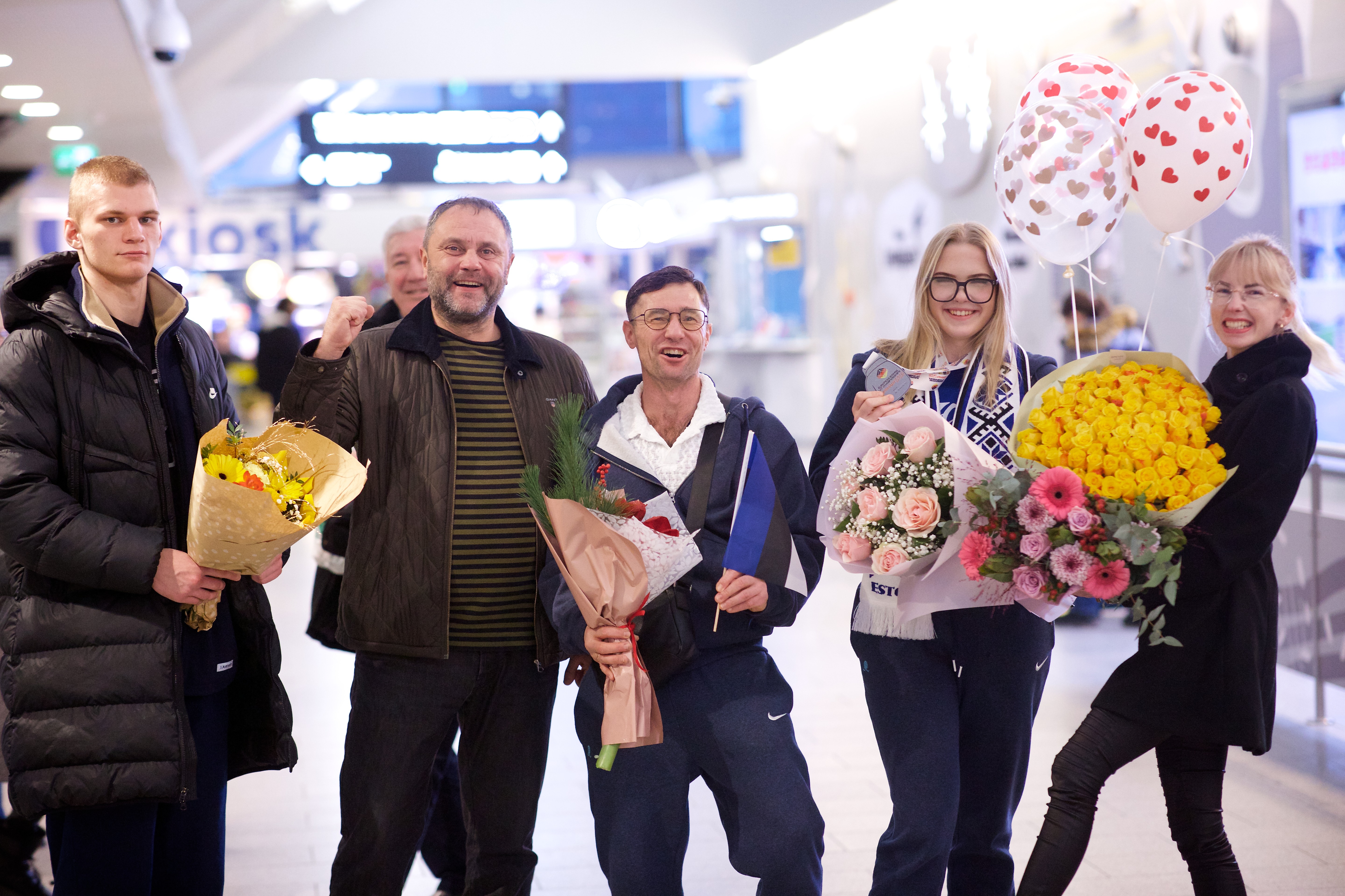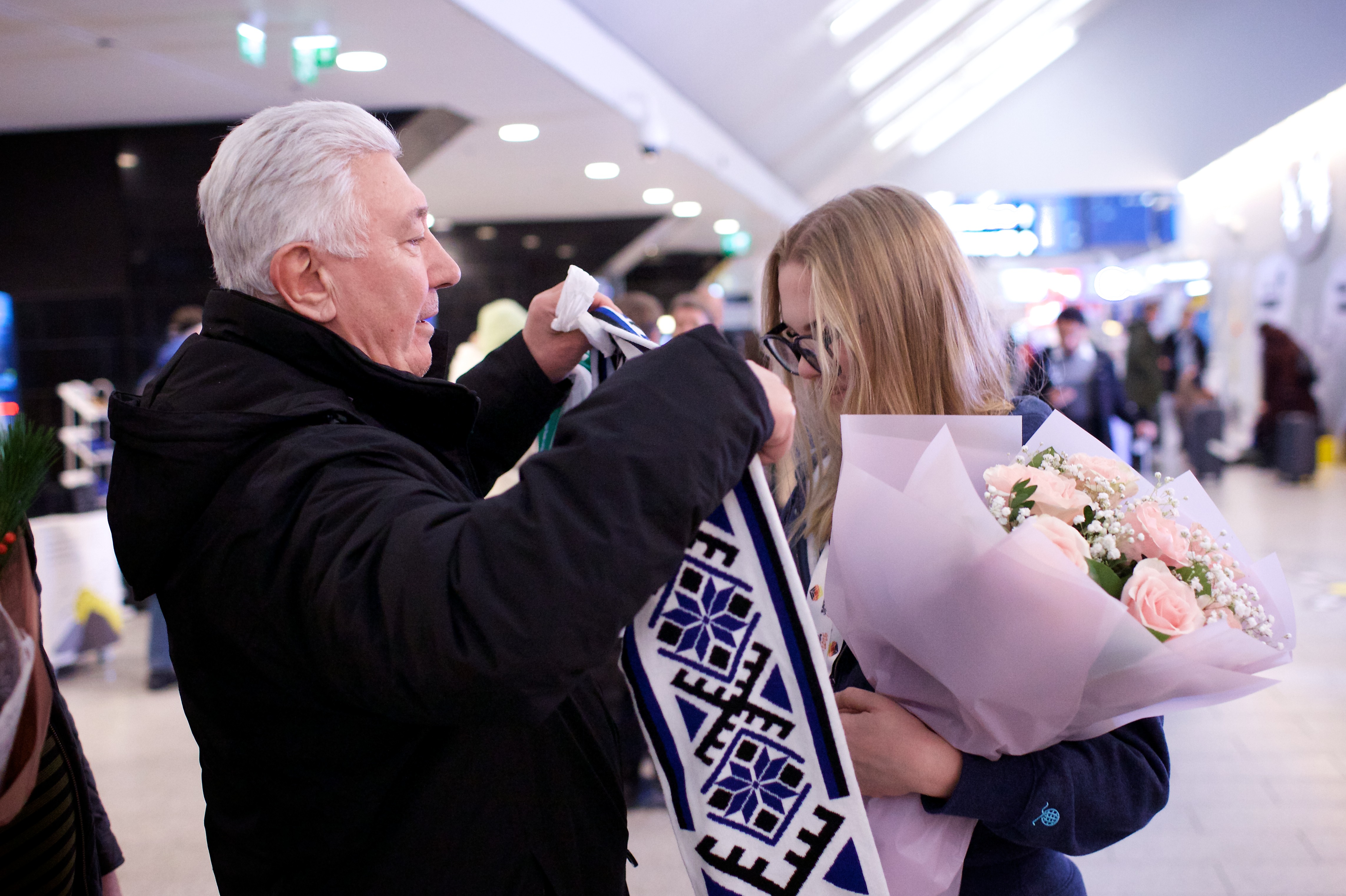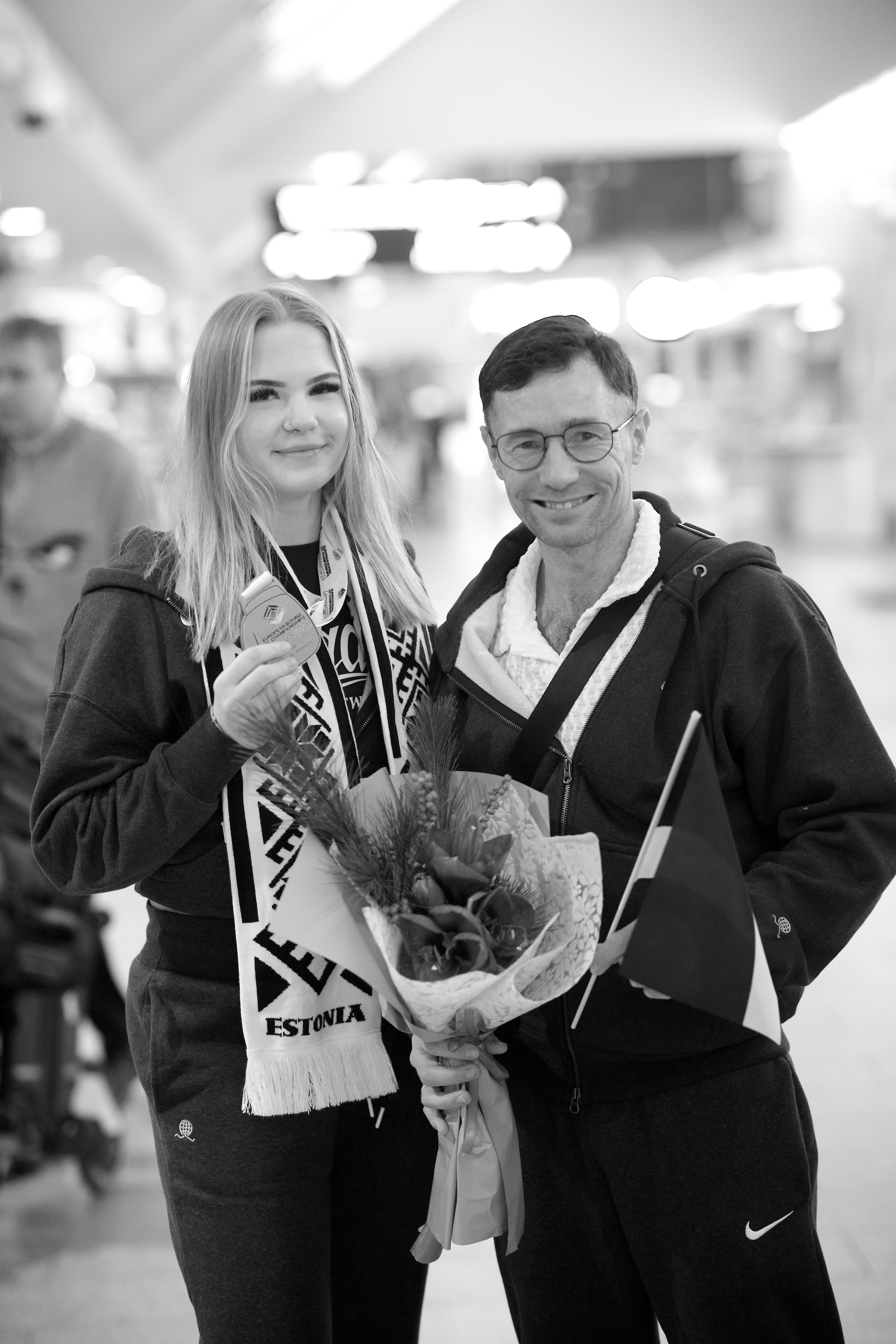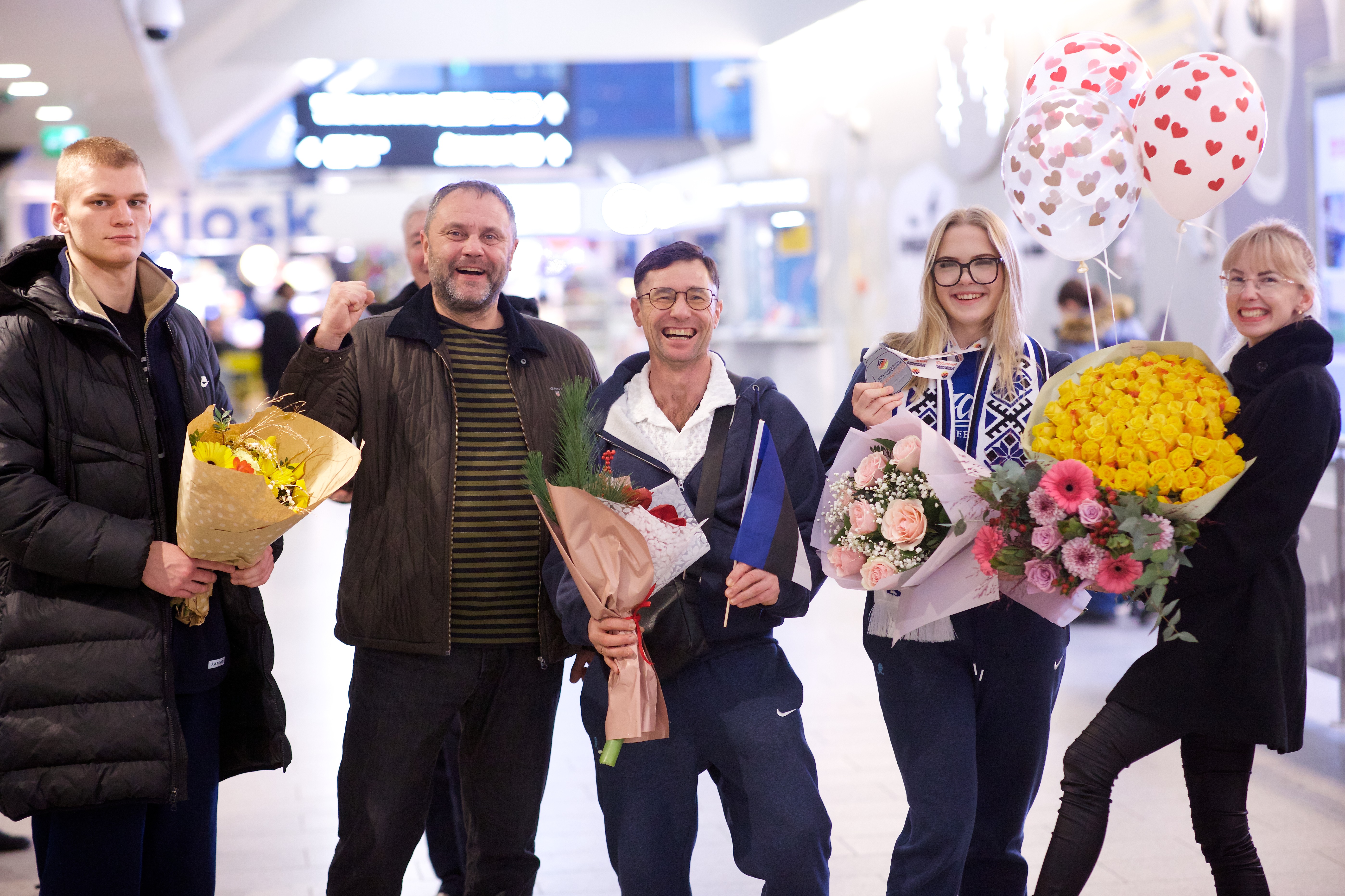 Pilte Melana Nelgi ja tema treeneri Jevgeni Golovatši vastuvõtust Lennart Meri lennujaamas.