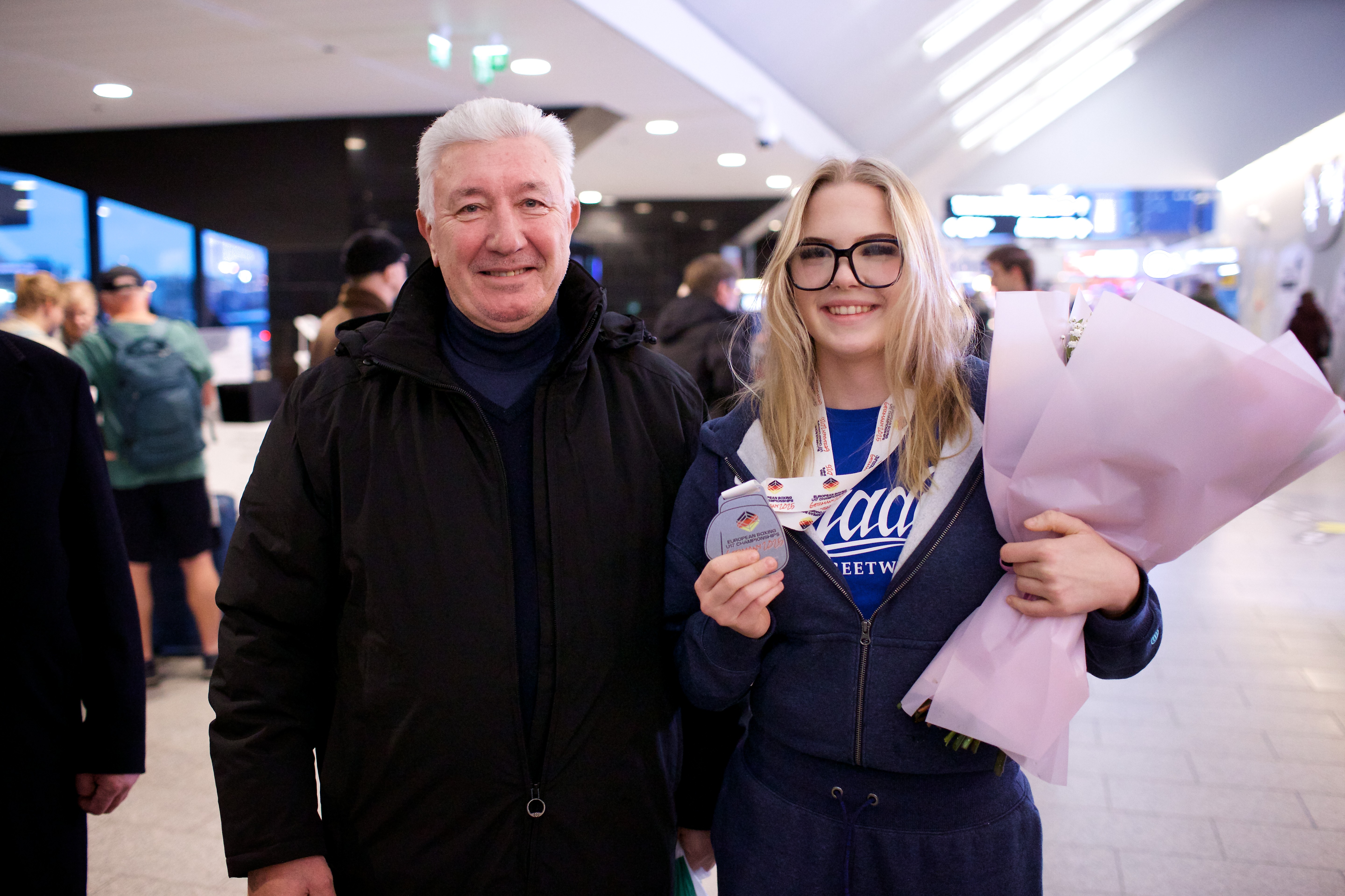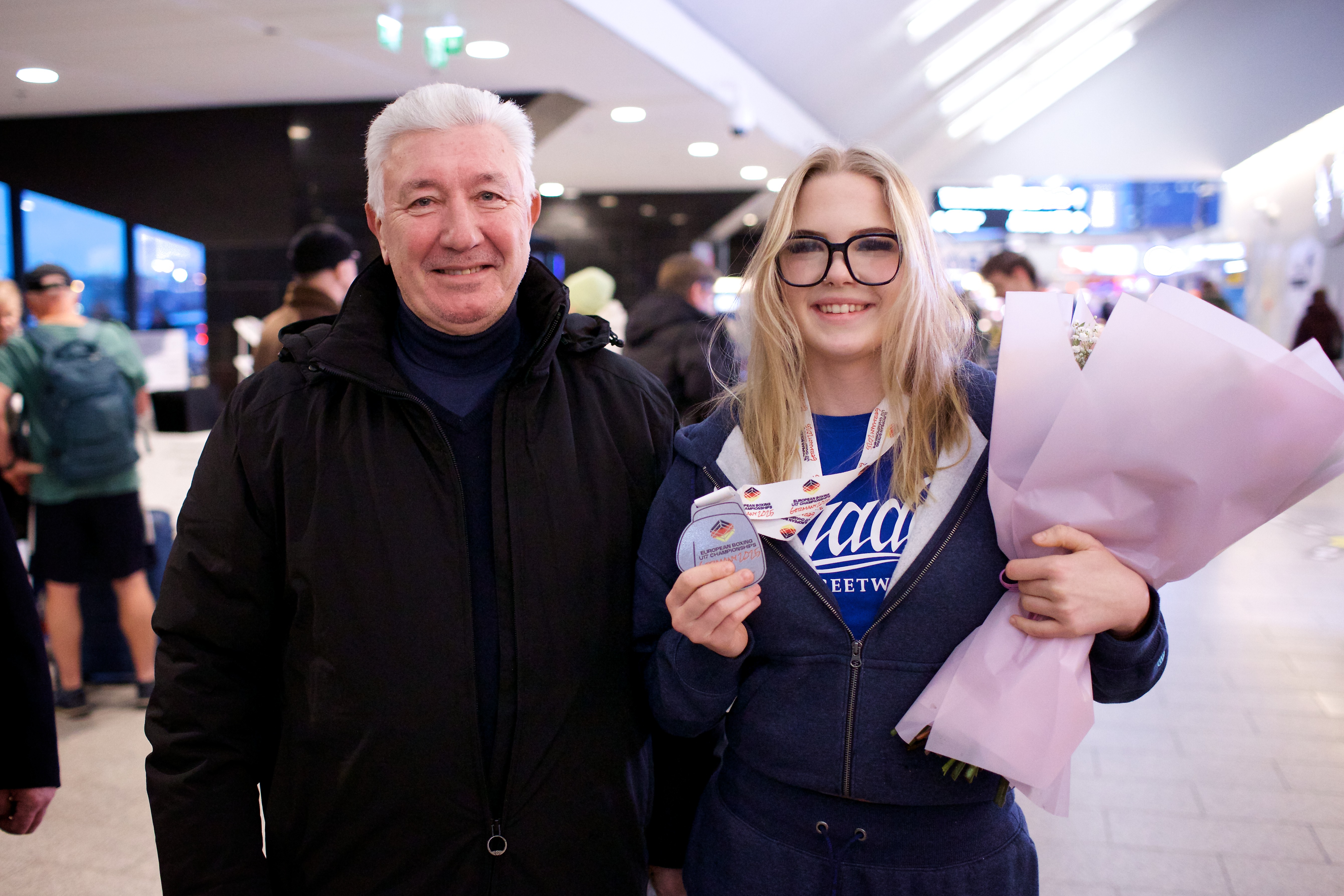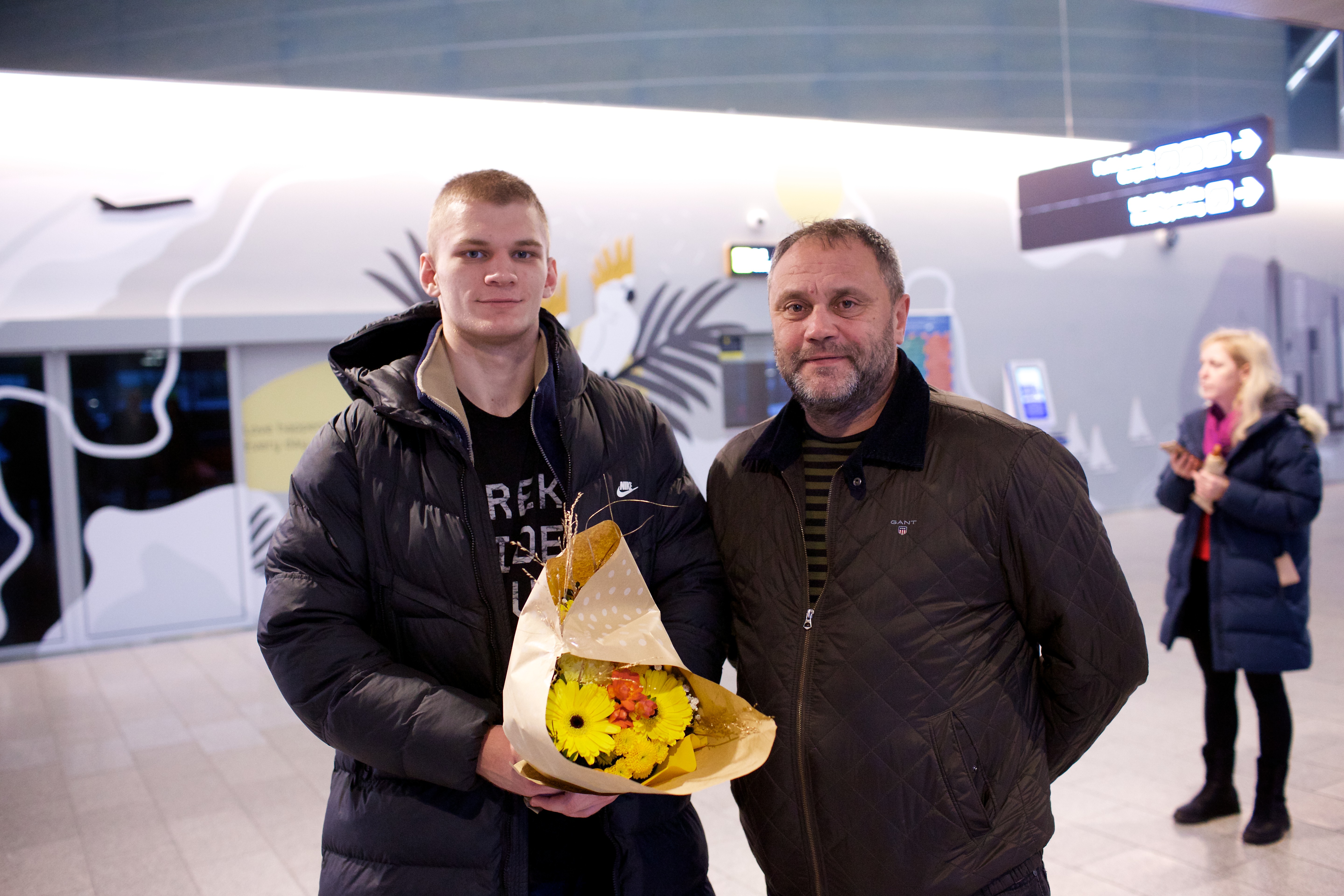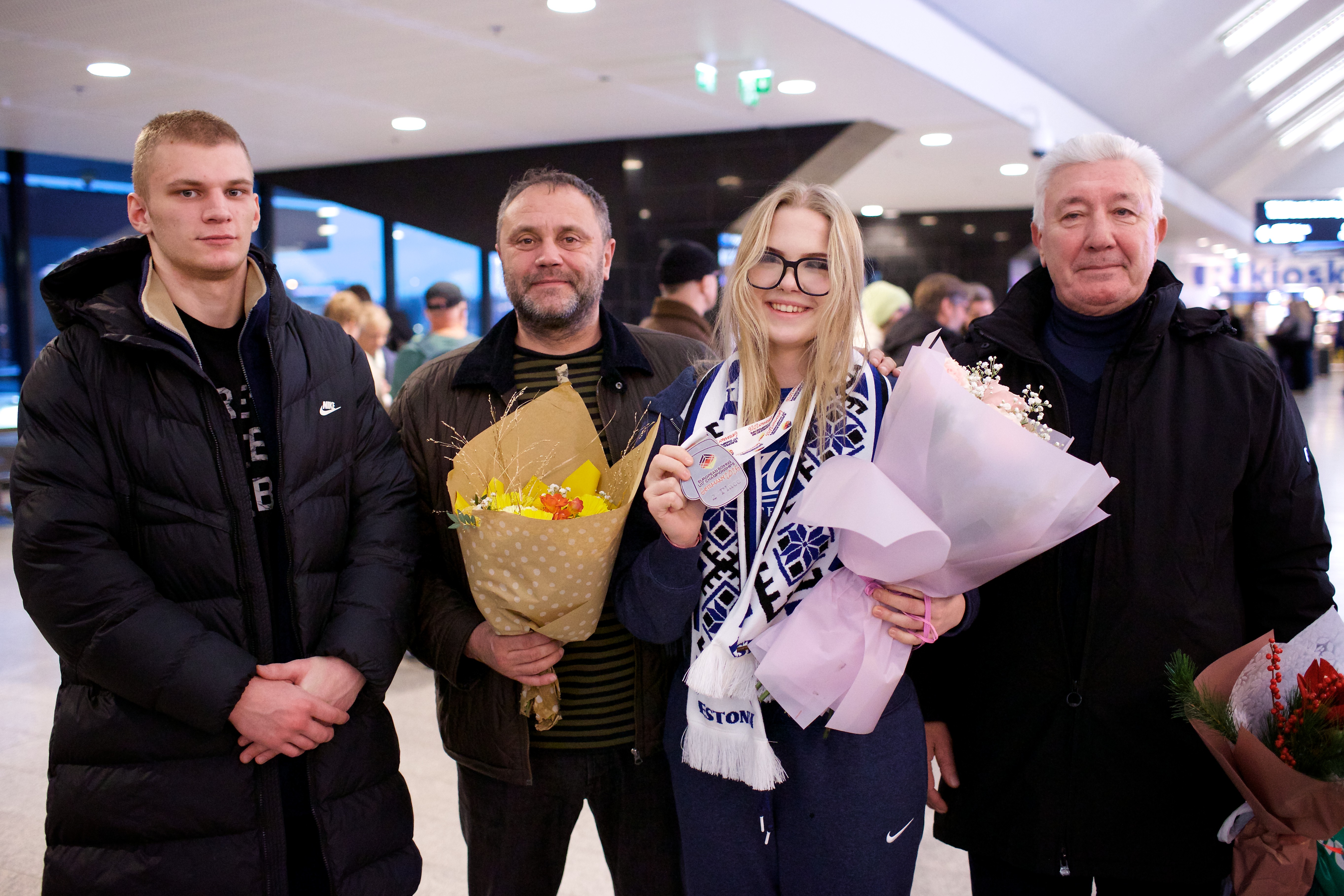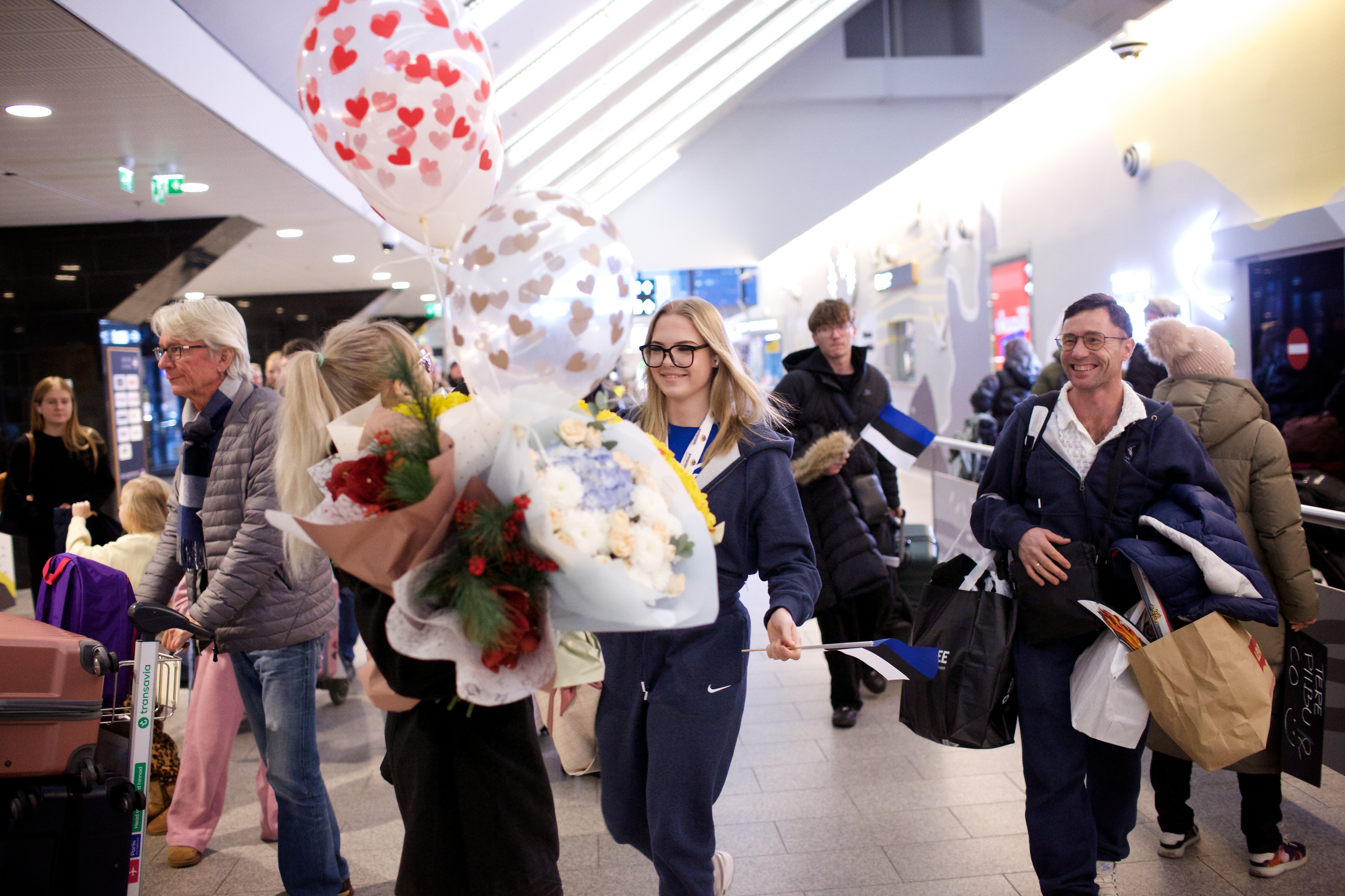 Pilte Melana Nelgi ja tema treeneri Jevgeni Golovatši vastuvõtust Lennart Meri lennujaamas.