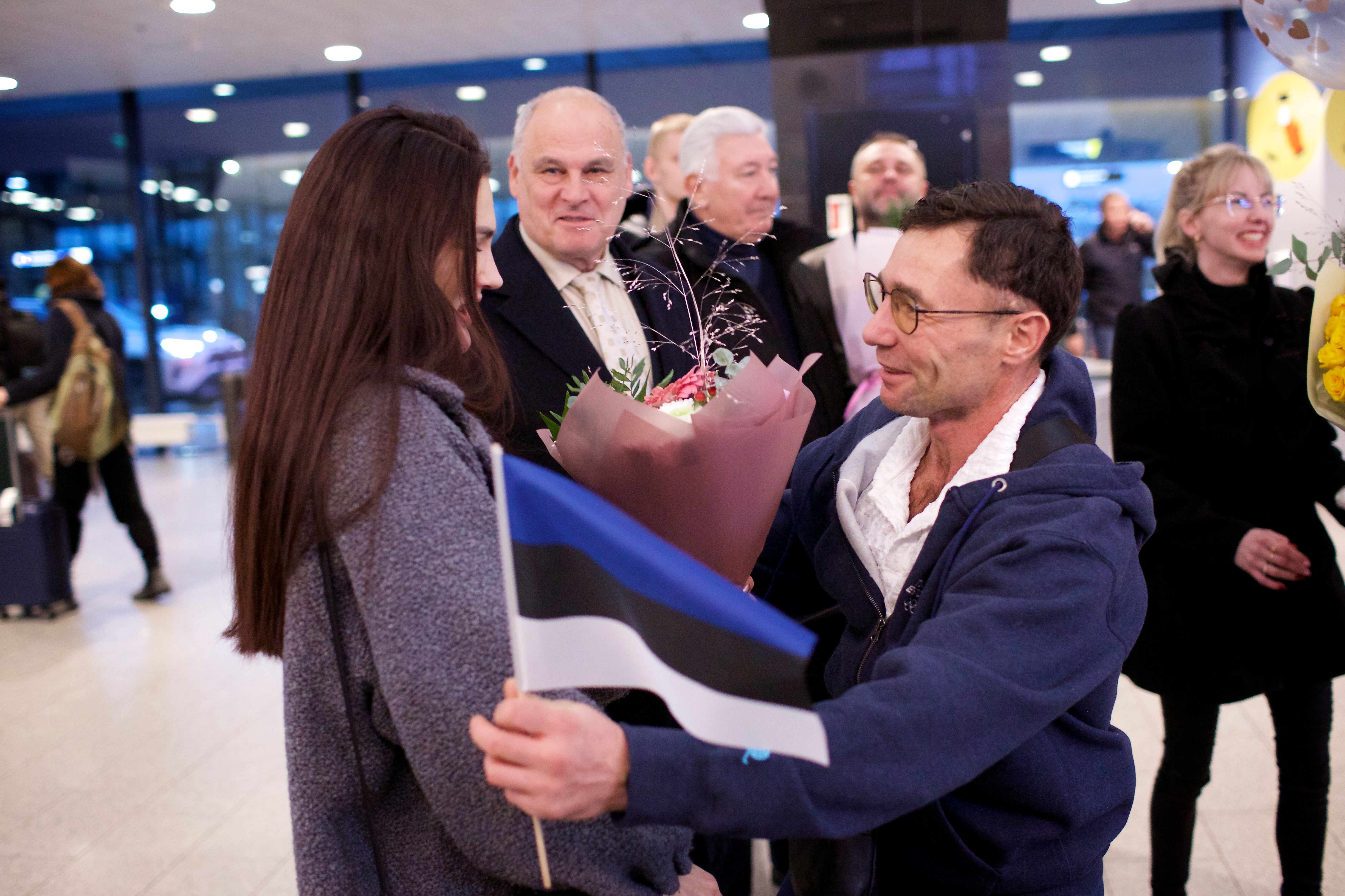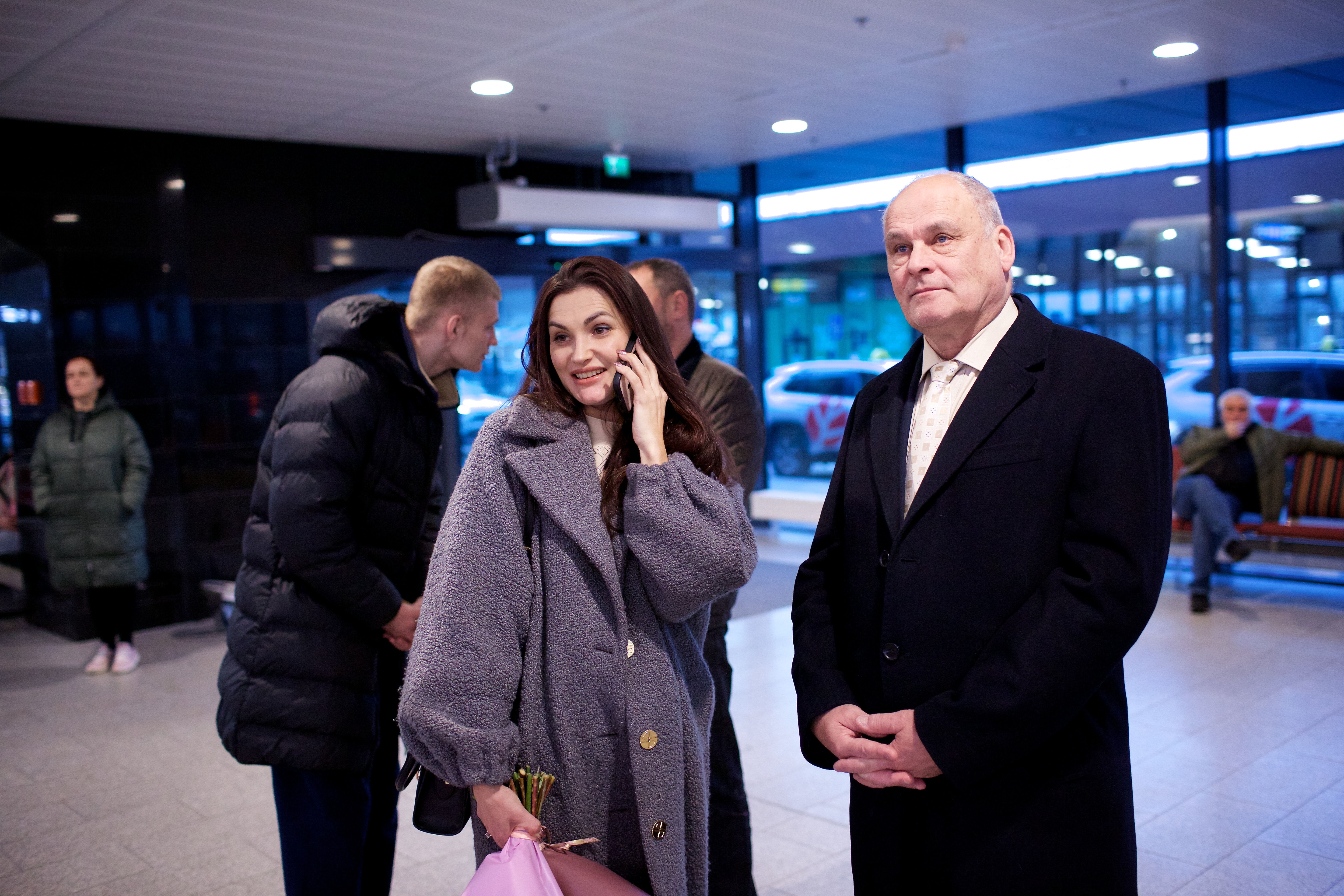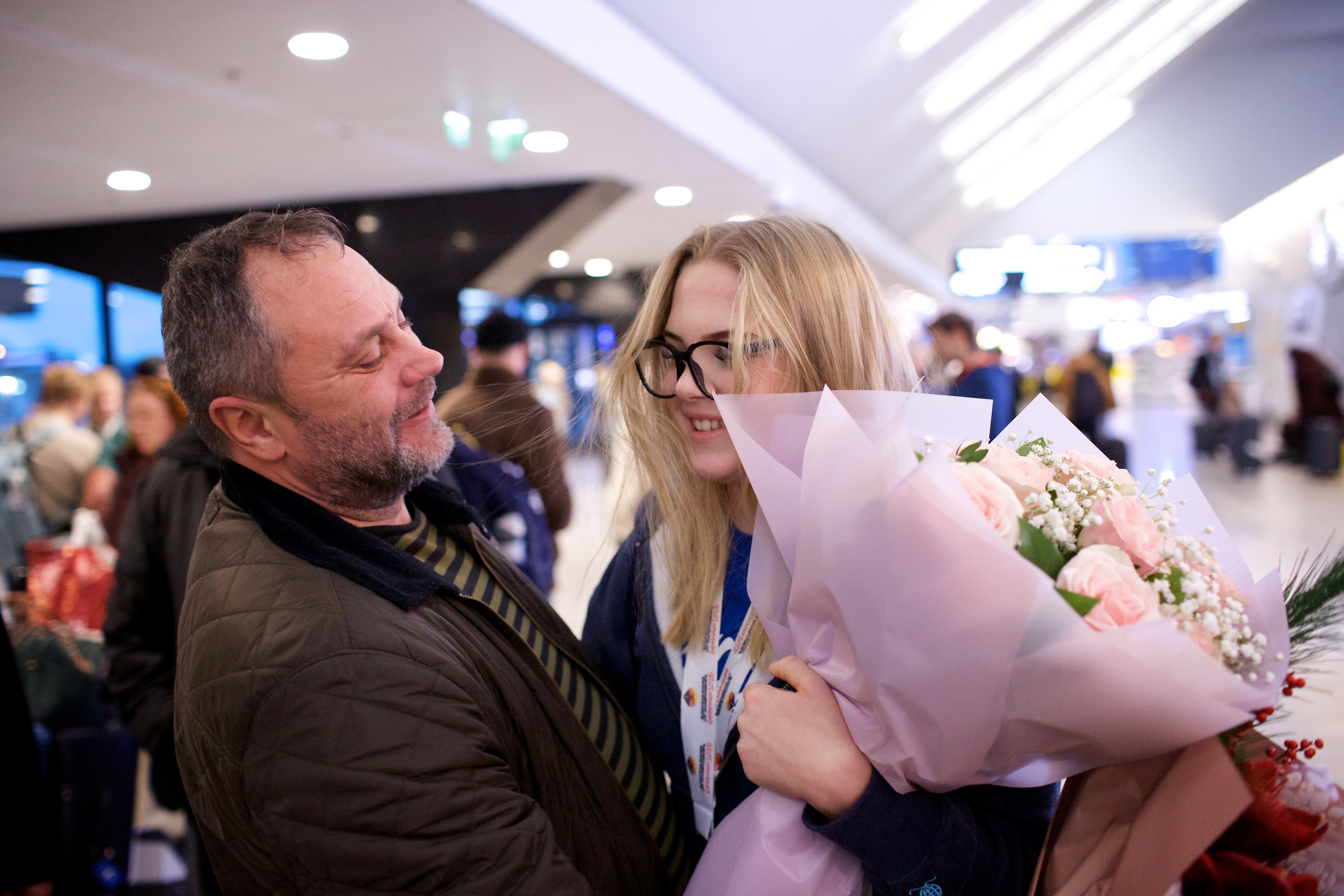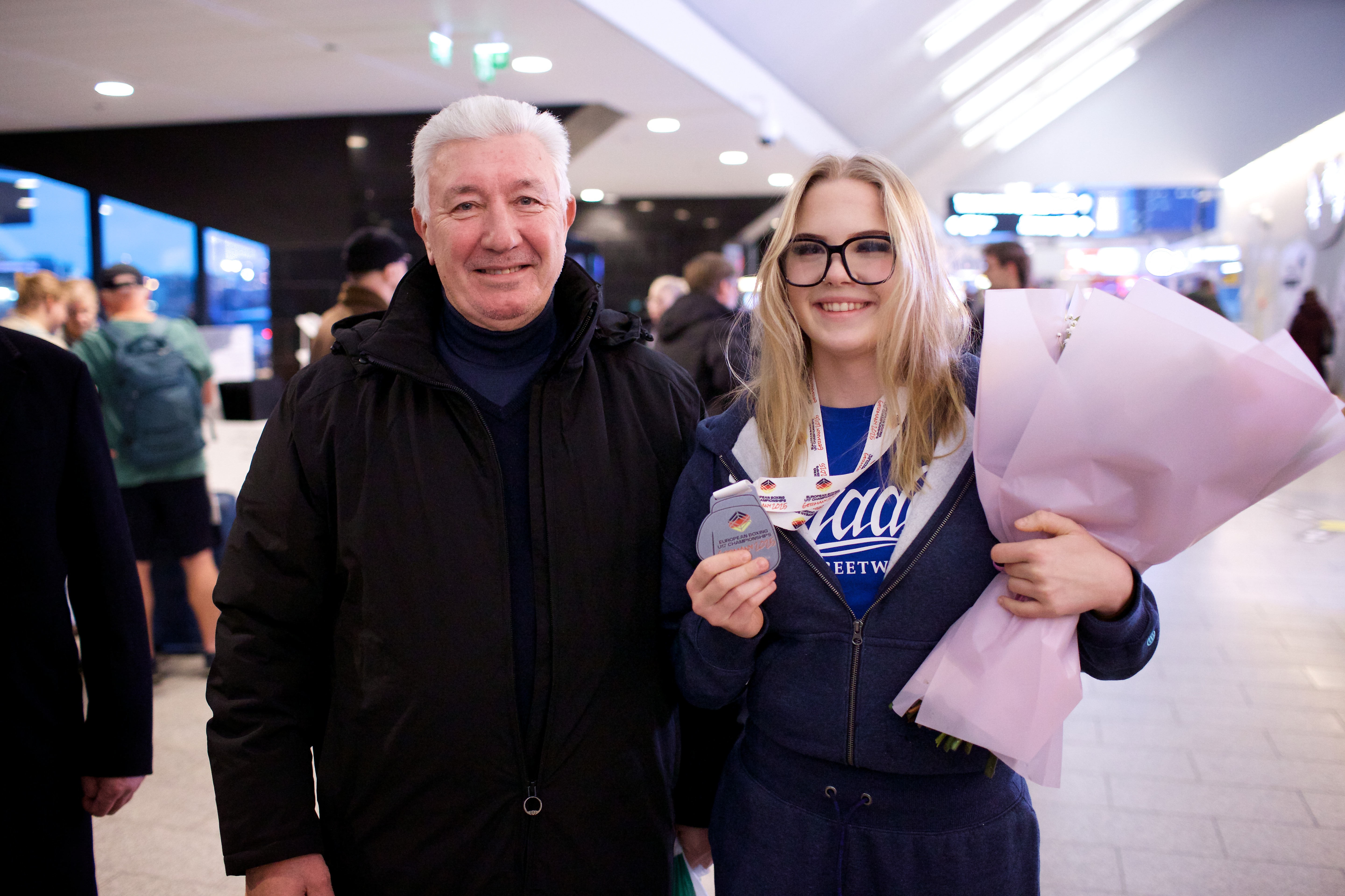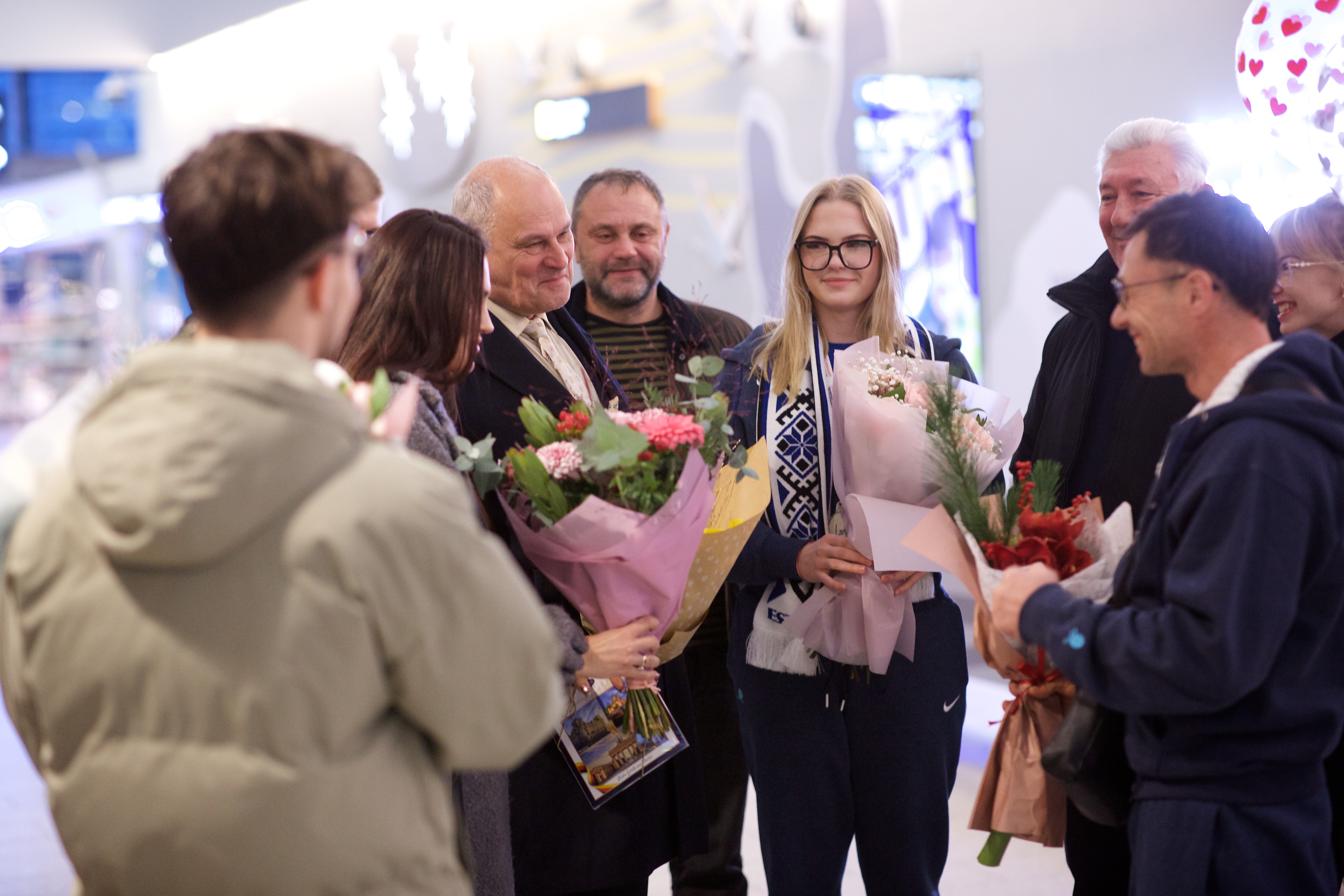 Pilte Melana Nelgi ja tema treeneri Jevgeni Golovatši vastuvõtust Lennart Meri lennujaamas.